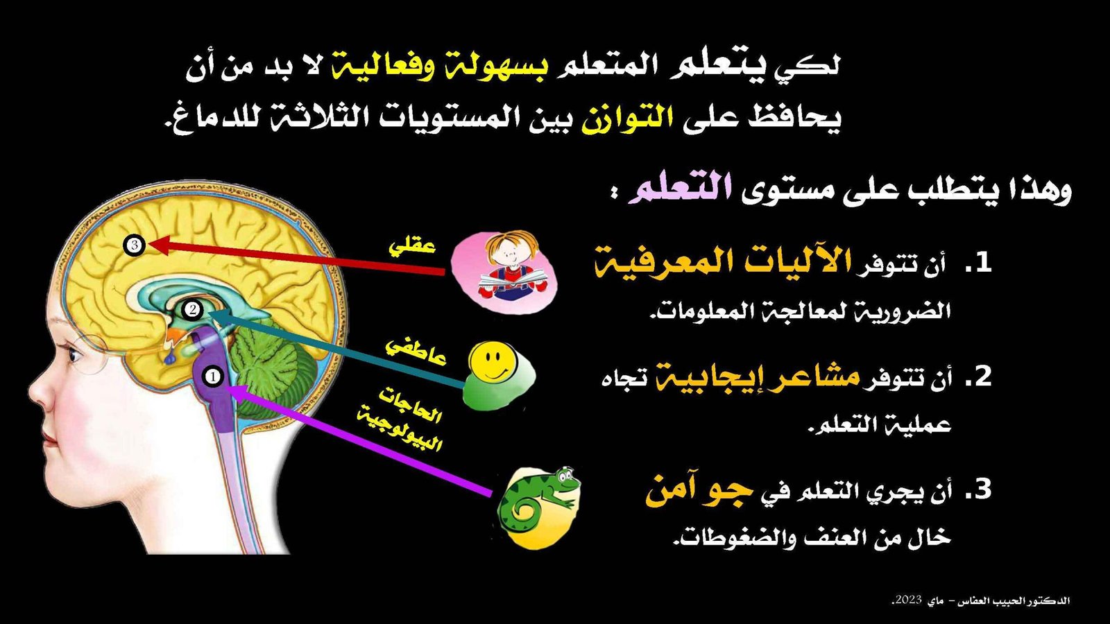 عندما تشعر بالتهديد أو التوتر، يتولى دماغك البدائي السيطرة على هذا الوضع ويقطع الوصول إلى الوظائف العليا في دماغك. لذلك يستحيل التعلم بفعالية في وضع التوتر والتشنج والقلق. لذا فالبيئة الودودة هي الأساس.