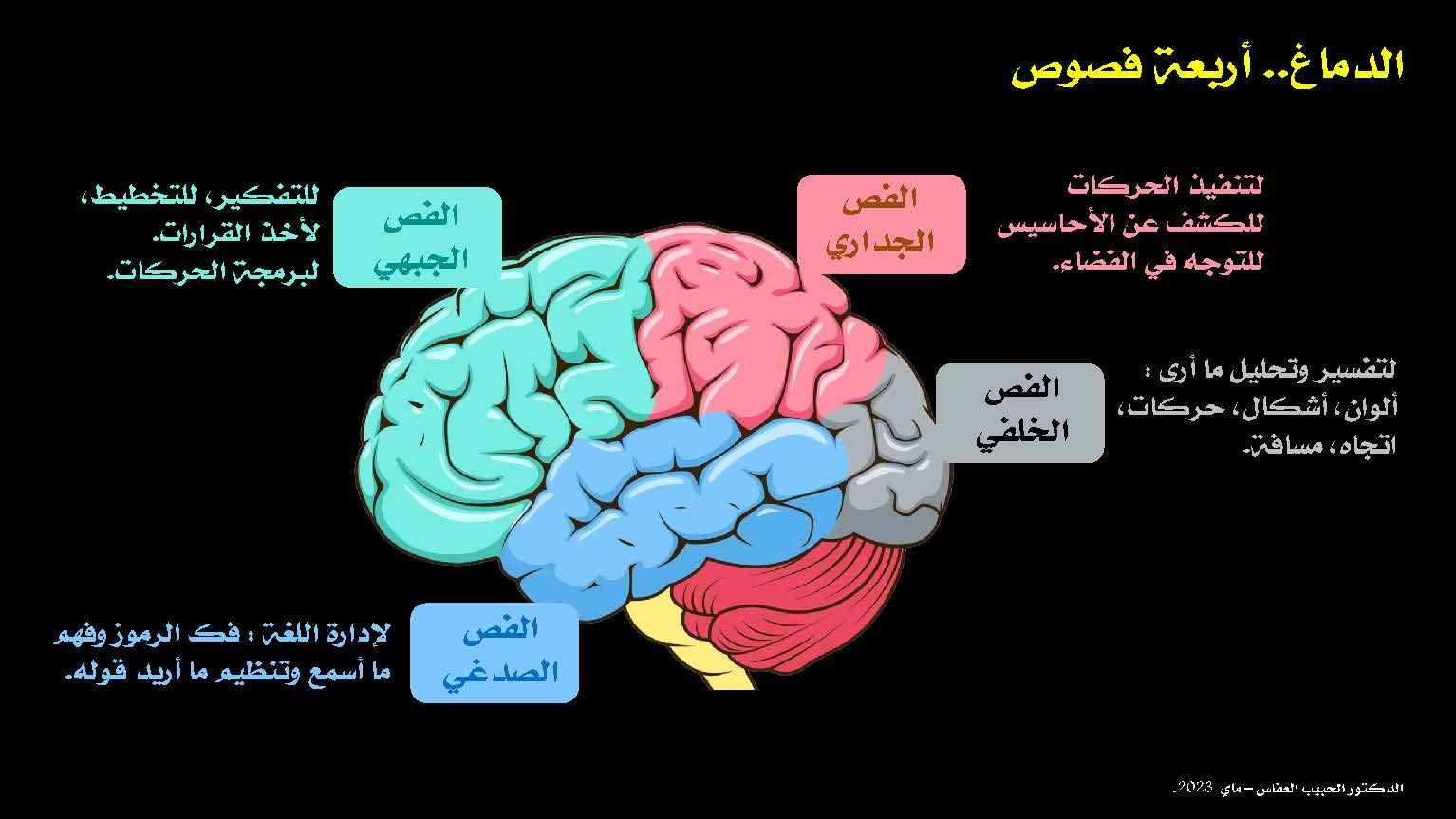 دعونا نغوص معا في هذه السيمفونية العصبية الرائعة، ونستكشف مع بعض، بنية هذه الشبكة المذهلة. سنقوم برسم خريطة «المتخصصين» الأربعة الرئيسيين – فصوص الدماغ – وسنرى، من خلال مثال ملموس، كيف يتعاونون لتحويل فكرة بسيطة إلى إنجاز.