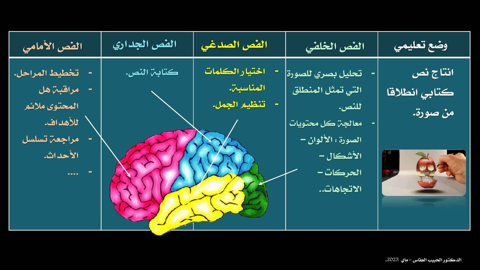 - عملية الكتابة (الفص الجداري) أخيرا، بمجرد وضع الخطة، يدخل الفص الجداري حيز التنفيذ. يتولى قيادة العمليات الحركية، منسقا عضلات يدك وأصابعك لتنفيذ الفعل الجسدي لكتابة (أو طباعة) النص الذي رأته الفصوص الأخرى وفهمته وخططت له.
